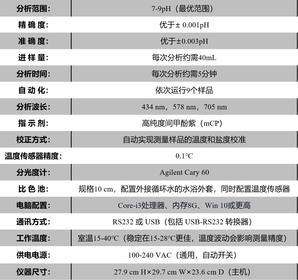Apollo SciTech 公司开发的分光光度法pH分析仪,是国际领先的pH分析仪,用于高精度和高准确度、自动化快速测定海水的pH值,并实时记录测量条件下的温度值,是现有的精确度最高、重复性最好的pH分析仪器!它基于使用pH指示剂(间甲酚紫)在三个波长(434nm,578nm,705nm)下比色测定相对颜色强度的原理,其中前两个波长吸收作为pH的已知函数,第三个用作基线校正。