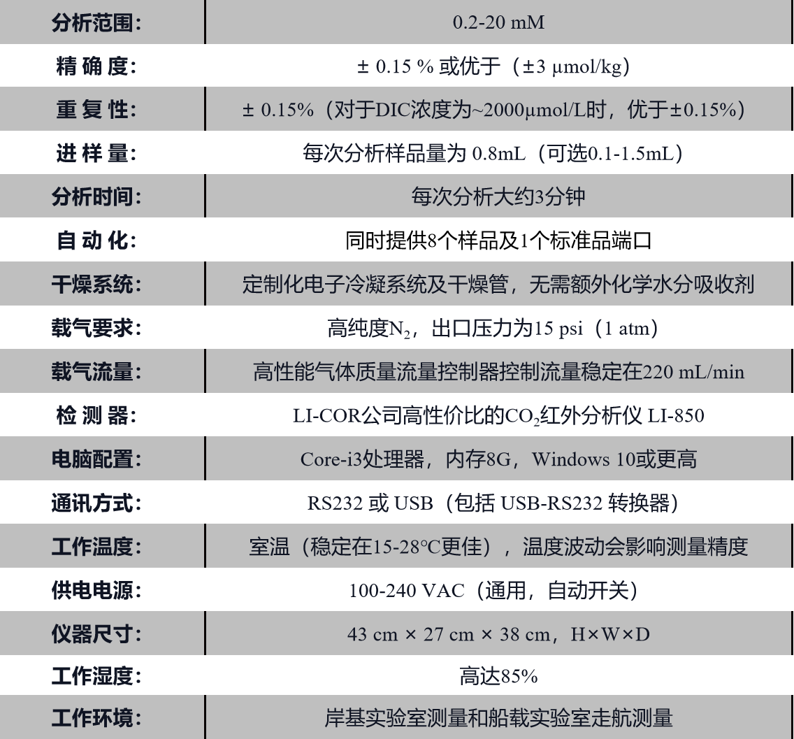 Apollo SciTech公司开发的总溶解性无机碳(DIC)分析仪,是国际领先的DIC分析仪,可用于分析各种水环境中的溶解性无机碳。该分析仪内部集成了LI-COR公司高性价比的非色散红外CO2检测器LI-850,为样品的DIC分析提供了优异性能。