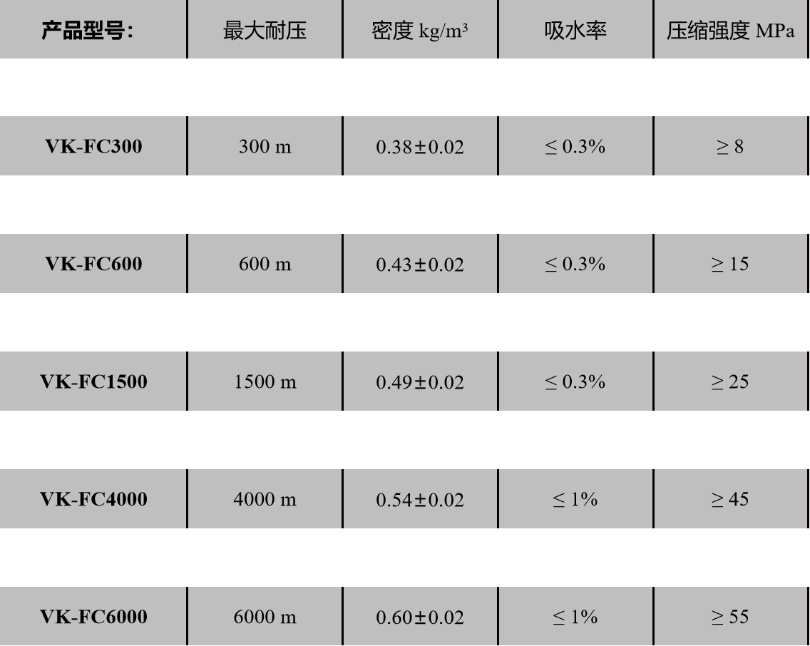 青岛碳测科技有限公司(简称碳测科技)研制的VK-FC系列固体浮力材料具有密度低、高强度、耐腐蚀性、吸水率低、稳定等特点,是一种理想的高强度轻质耐压复合材料。该材料可采用锯﹑刨﹑车﹑磨等加工方法,按照客户需求进行加工尺寸形状,便于现场装配。