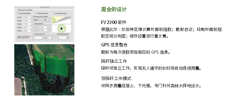 LAI-2200C 基于成熟的 LAI-2000 技术平台,内置 GPS 模块,通过散射光校正,LAI-2200C 适用于任何天空条件下的冠层测量。GPS 数据还可叠加至 Google Earth 上生成冠层信息地图。利用专业 FV2200 软件,可对数据进行深入处理分析。