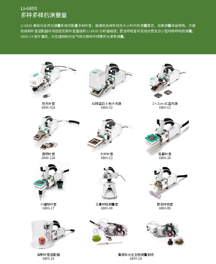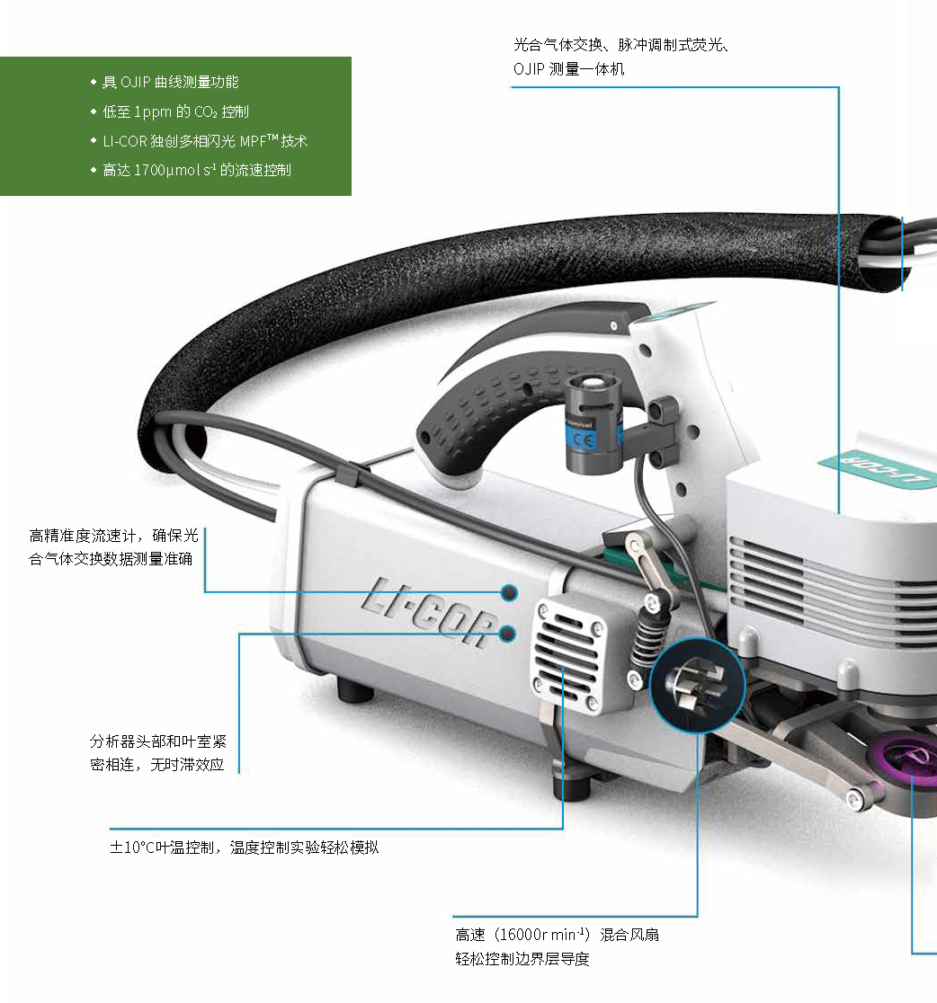 LI-6800 是一款兼具光合气体交换、脉冲调制式叶绿素荧光、快速叶绿素荧光诱导动力学 OJIP 曲线、土壤呼吸“四位一体”测量功能的仪器。
