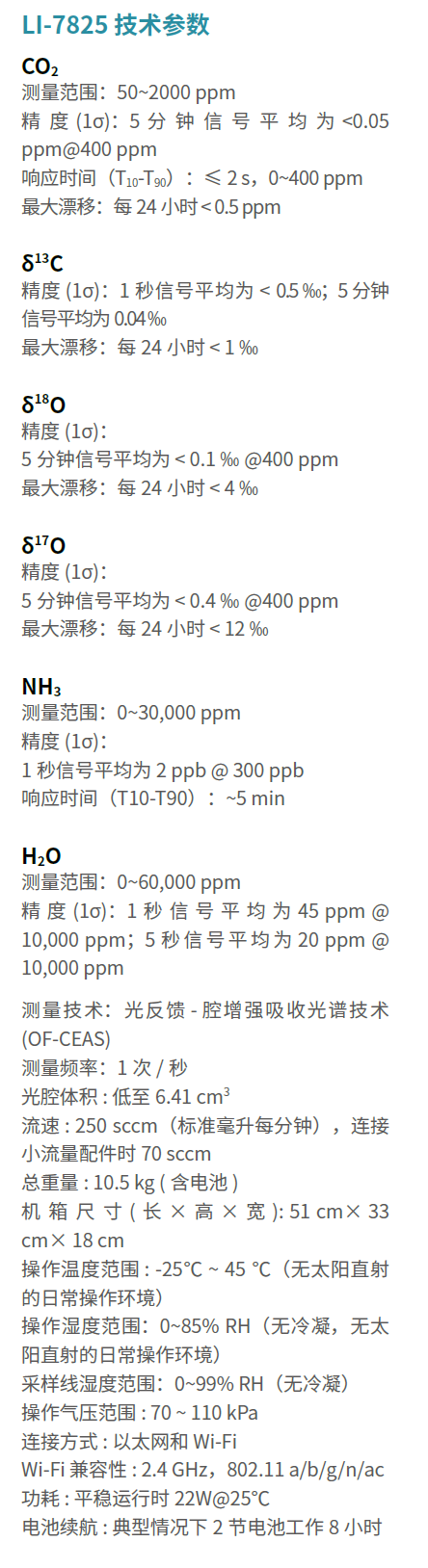 LI-7825 高精度 CO2 同位素/NH3 气体分析仪,测量大气中丰度最高的 4 种 CO2 同位素异构体,并高精准度报告δ13C 、δ17O 和 δ18O 。与LI-COR 其他痕量气体测量家族成员一样,LI-7825 兼具坚固、便携、低功耗的特点。LI-7825 主 要用于以下研究: ● 确定大气中的碳来源 ● 将净生态系统碳通量进行拆分 ● 植物生理精细过程分析 ● 评估碳封存效果